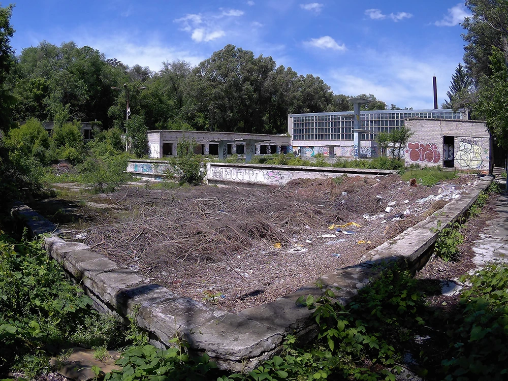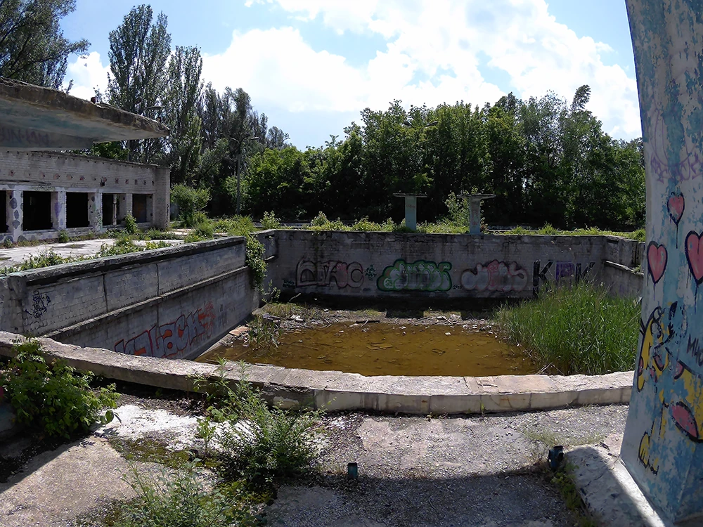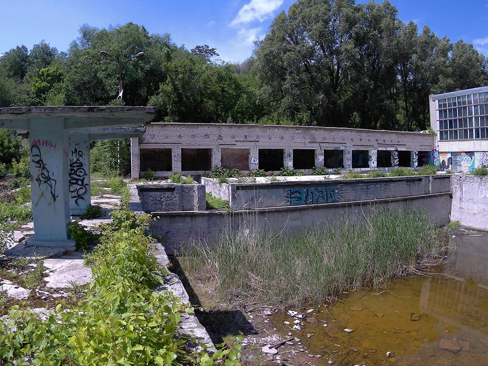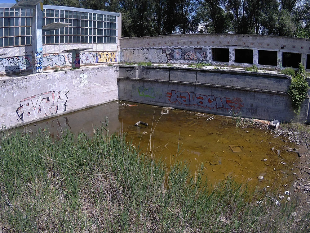 З першого погляду складно зрозуміти, що перед тобою колись був повноцінний спортивний комплекс. Сьогодні об’єкт являє собою два величезних бетонних котловани, навколо яких розташовані занедбані будівлі та залишки конструкцій. Але варто придивитися уважніше — і стає зрозуміло, що це два відкритих басейни: один глибокий, призначений для стрибків у воду, другий — плавальний, з доріжками для тренувань і змагань.